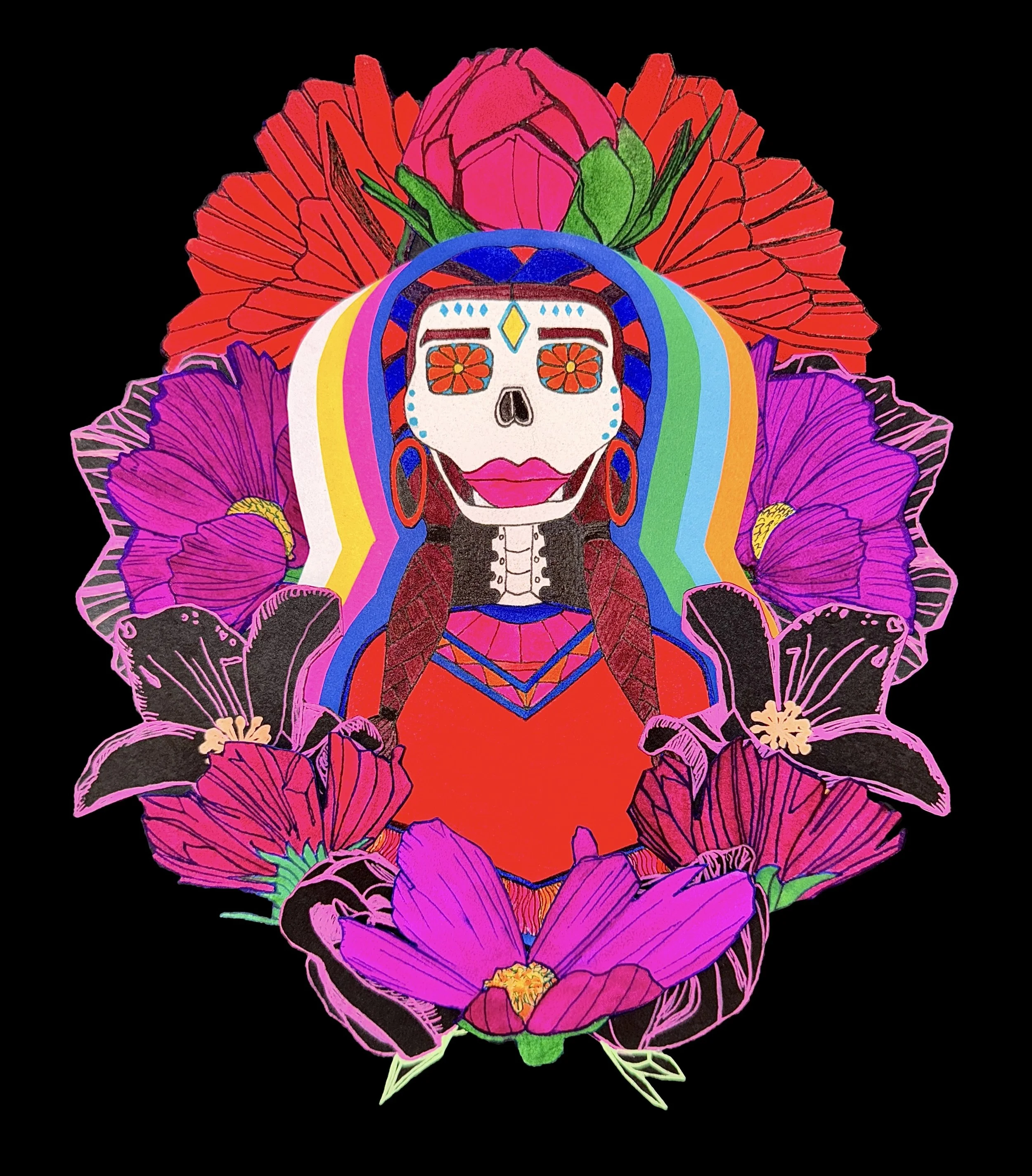 This design honors the matriarch, the Indigenous women of the Americas: those who migrated and those who have always been here. It’s a tribute to the womxn resisting oppression across this country. Her steady gaze and radiant form carry memory and survival. The glowing colors and flowers reflect our sacred connection to the divine and illuminate the presence of our ancestors.